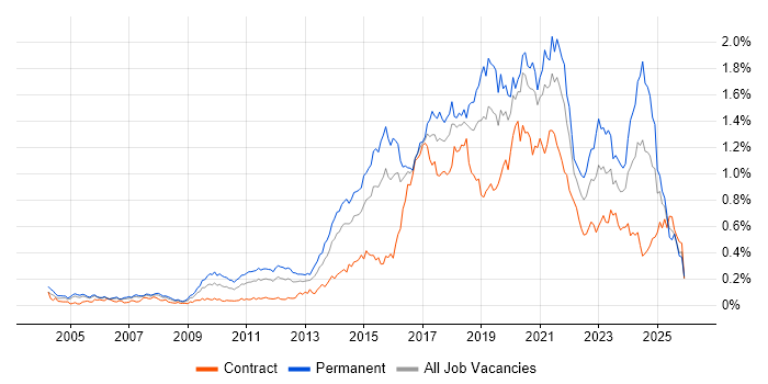 Historical trend showing the proportion of contract IT job postings citing R relative to all contract IT jobs advertised in Central London.
