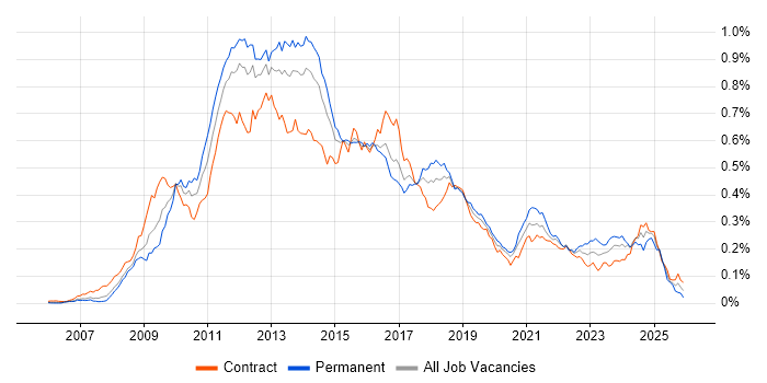 Historical trend showing the proportion of contract IT job postings citing Drupal relative to all contract IT jobs advertised in London.
