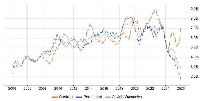 Historical trend showing the proportion of contract IT job postings citing Active Directory relative to all contract IT jobs advertised in the North West.