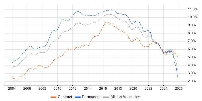 Historical trend showing the proportion of contract IT job postings citing Linux relative to all contract IT jobs advertised.