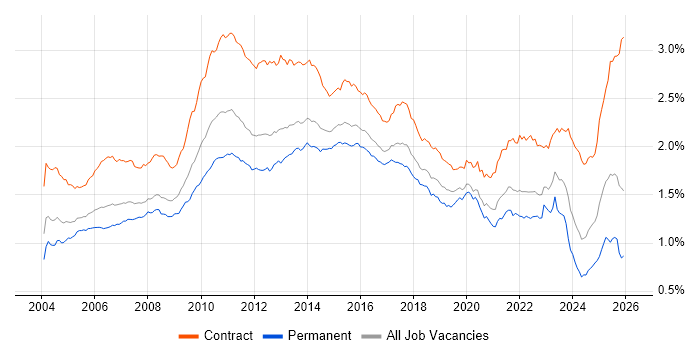 Historical trend showing the proportion of contract IT job postings citing User Acceptance Testing relative to all contract IT jobs advertised.