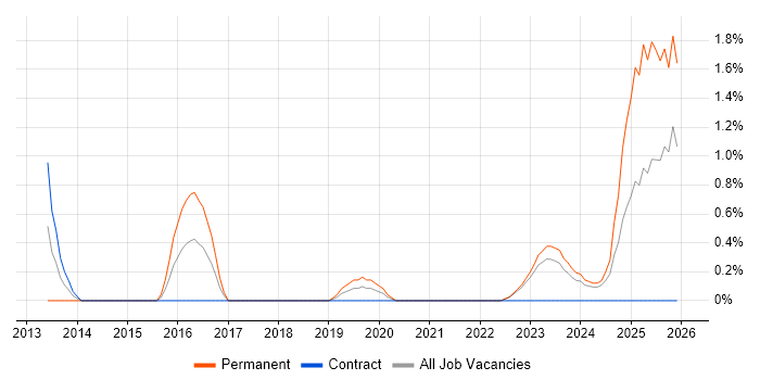 Historical trend showing the proportion of permanent IT job postings citing CompTIA Security+ relative to all permanent IT jobs advertised in Belfast.
