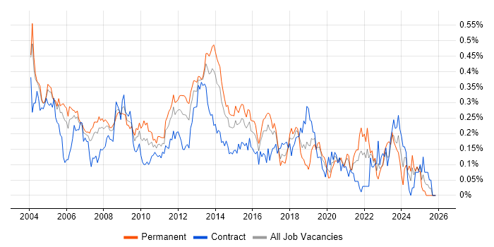 Historical trend showing the proportion of permanent IT job postings citing SMTP relative to all permanent IT jobs advertised in Central London.