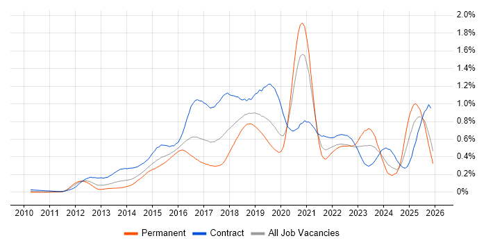 Historical trend showing the proportion of permanent IT job postings citing Digital Transformation Programme relative to all permanent IT jobs advertised in the City of London.