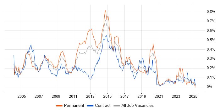 Historical trend showing the proportion of permanent IT job postings citing EIGRP relative to all permanent IT jobs advertised in the City of London.