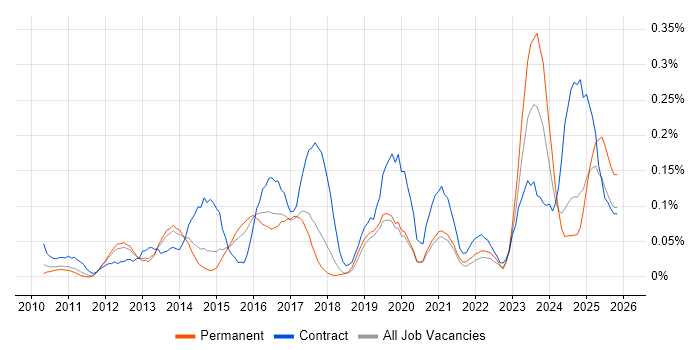 Historical trend showing the proportion of permanent IT job postings citing iTrent relative to all permanent IT jobs advertised in the East of England.