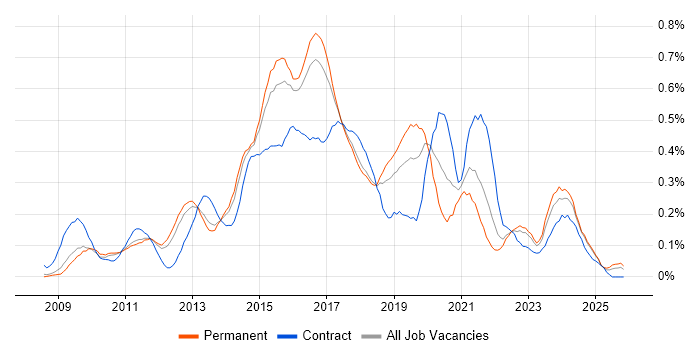 Historical trend showing the proportion of permanent IT job postings citing QlikView relative to all permanent IT jobs advertised in the East of England.