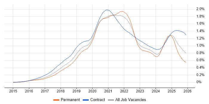 Historical trend showing the proportion of permanent IT job postings citing AWS Lambda relative to all permanent IT jobs advertised in England.