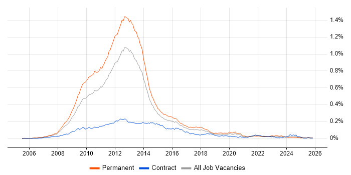 Historical trend showing the proportion of permanent IT job postings citing MCTS relative to all permanent IT jobs advertised in England.