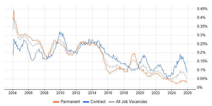 Historical trend showing the proportion of permanent IT job postings citing Oracle Workflow relative to all permanent IT jobs advertised in England.