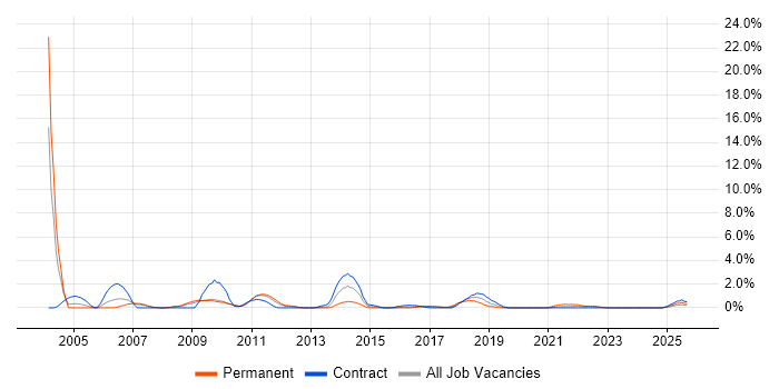 Historical trend showing the proportion of permanent IT job postings citing Content Management relative to all permanent IT jobs advertised in Exeter.