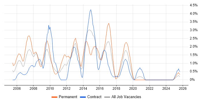 Historical trend showing the proportion of permanent IT job postings citing Photoshop relative to all permanent IT jobs advertised in Exeter.