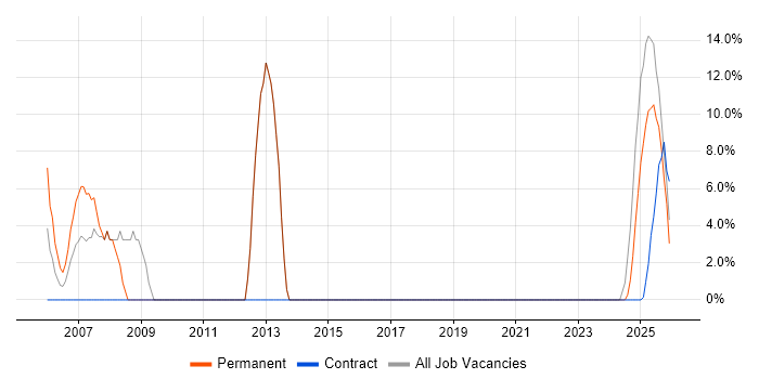 Historical trend showing the proportion of permanent IT job postings citing Games relative to all permanent IT jobs advertised in Glamorgan.