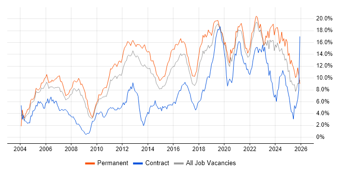 Historical trend showing the proportion of permanent IT job postings citing Software Engineering relative to all permanent IT jobs advertised in Gloucestershire.