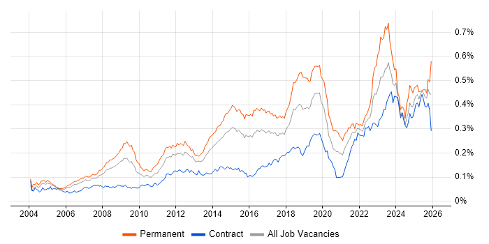 Historical trend showing the proportion of permanent IT job postings featuring 'IT Support Engineer' in the job title relative to all permanent IT jobs advertised in London.
