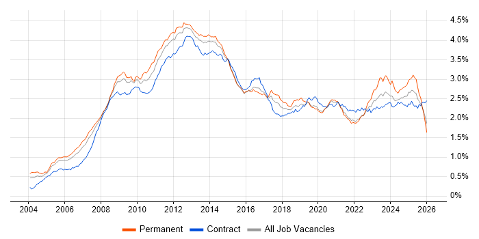 Historical trend showing the proportion of permanent IT job postings citing SharePoint relative to all permanent IT jobs advertised in London.