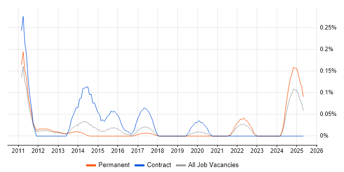 Historical trend showing the proportion of permanent IT job postings citing ACSP relative to all permanent IT jobs advertised in Manchester.