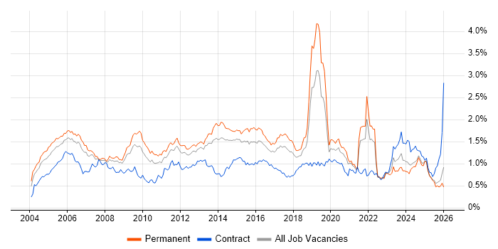 Historical trend showing the proportion of permanent IT job postings citing CCNA relative to all permanent IT jobs advertised in the North of England.