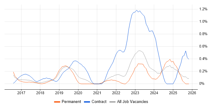 Historical trend showing the proportion of permanent IT job postings citing Jest relative to all permanent IT jobs advertised in Nottinghamshire.