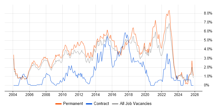 Historical trend showing the proportion of permanent IT job postings citing SDLC relative to all permanent IT jobs advertised in Oxford.