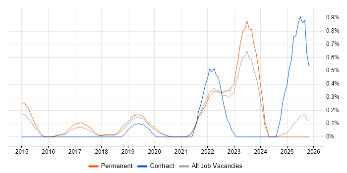 Historical trend showing the proportion of permanent IT job postings citing MuleSoft relative to all permanent IT jobs advertised in Oxfordshire.