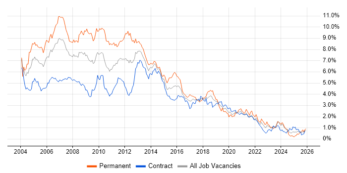 Historical trend showing the proportion of permanent IT job postings citing XML relative to all permanent IT jobs advertised in Scotland.