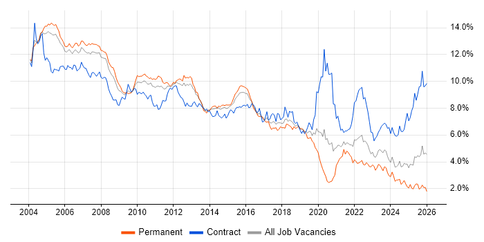 Historical trend showing the proportion of permanent IT job postings citing Oracle relative to all permanent IT jobs advertised in the Thames Valley.
