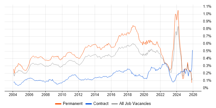 Historical trend showing the proportion of permanent IT job postings featuring 'Java Software Engineer' in the job title relative to all permanent IT jobs advertised in the UK excluding London.