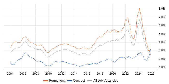 Historical trend showing the proportion of permanent IT job postings featuring 'Software Engineer' in the job title relative to all permanent IT jobs advertised in the UK excluding London.