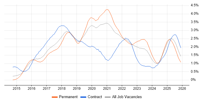 Historical trend showing the proportion of permanent IT job postings citing Ansible relative to all permanent IT jobs advertised in West Yorkshire.