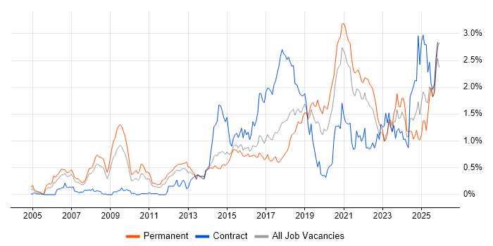 Historical trend showing the proportion of permanent IT job postings citing PostgreSQL relative to all permanent IT jobs advertised in West Yorkshire.