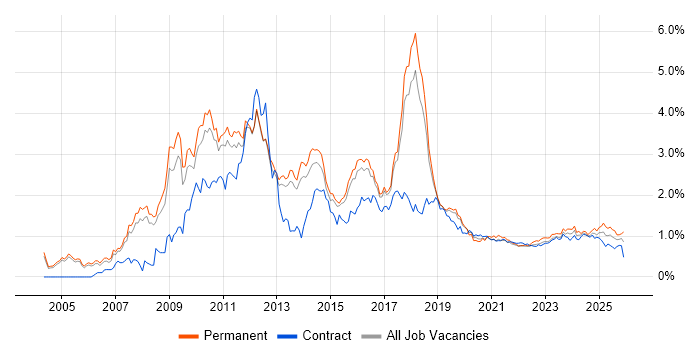 Historical trend showing the proportion of permanent IT job postings citing Dynamics CRM and offering remote or hybrid work options relative to all permanent IT jobs advertised.