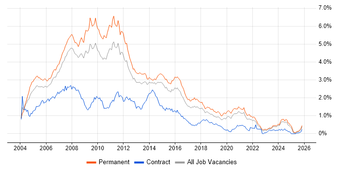 Historical trend showing the proportion of permanent IT job postings featuring 'Web Developer' in the job title relative to all permanent IT jobs advertised in Yorkshire.